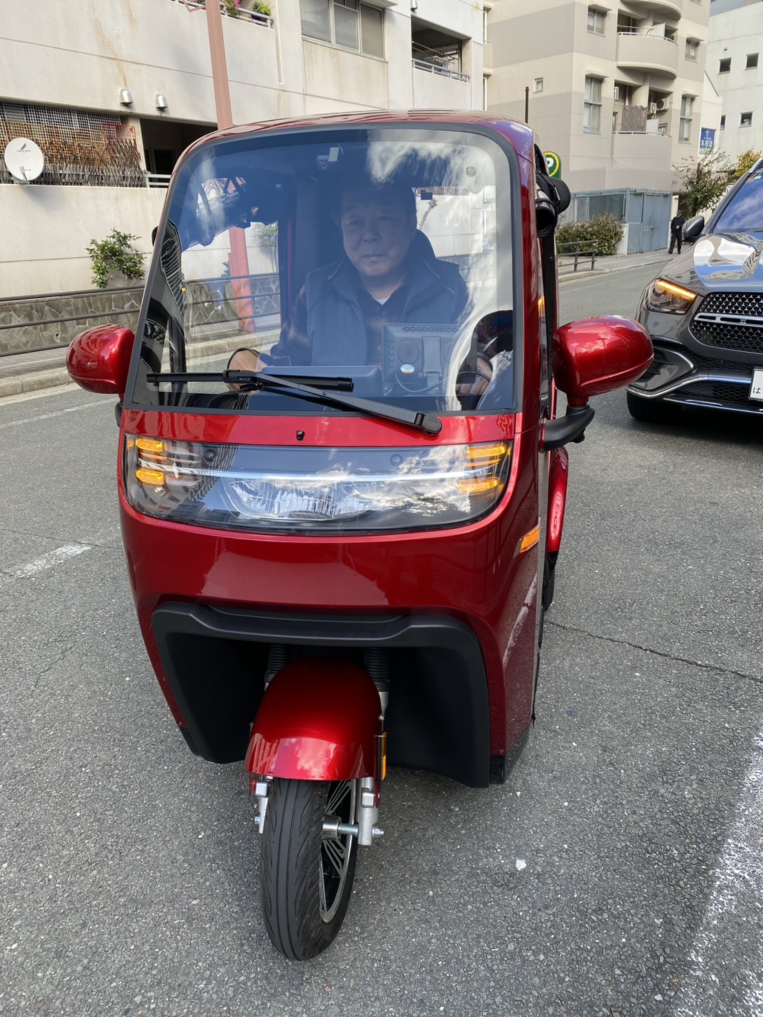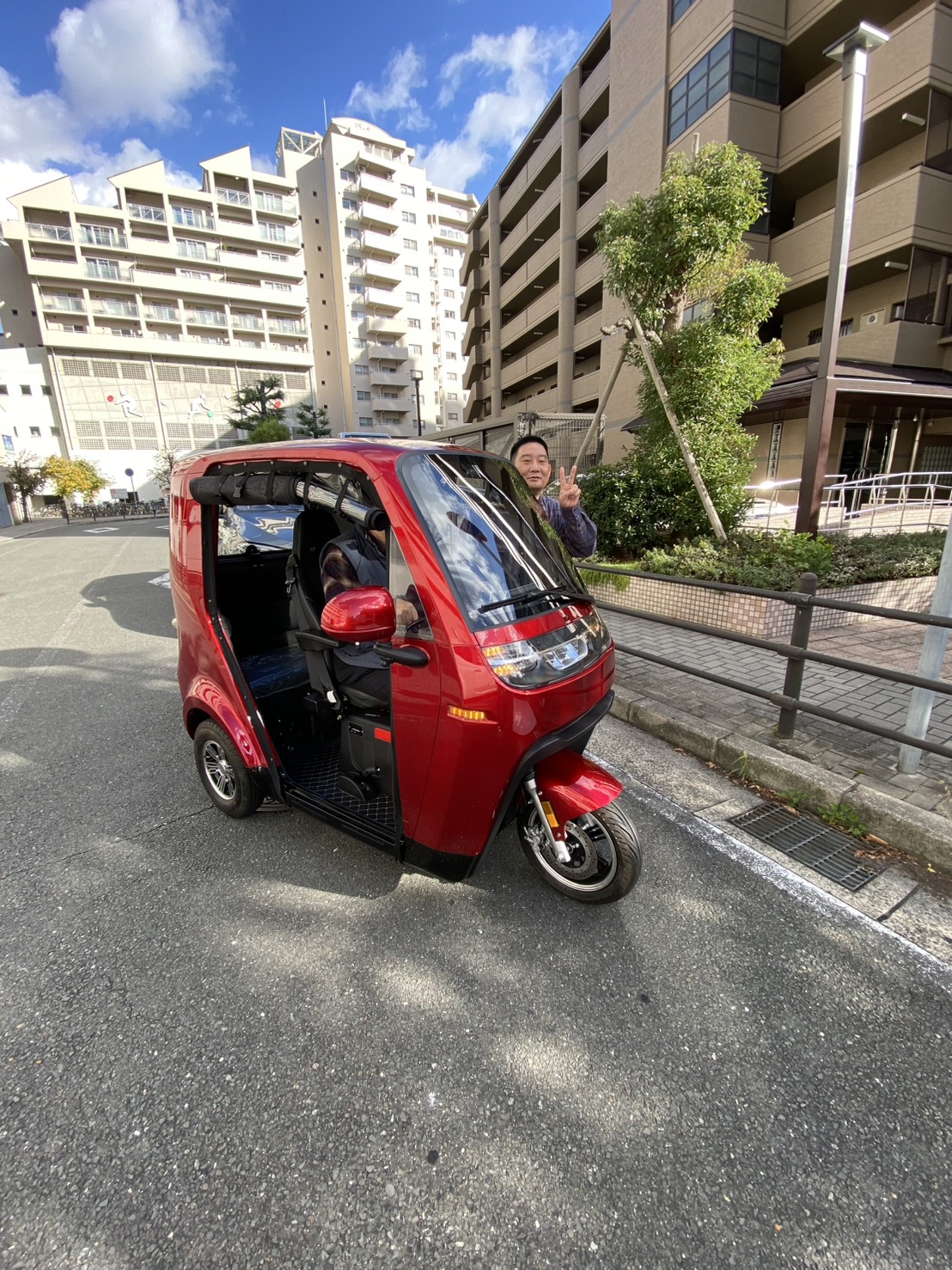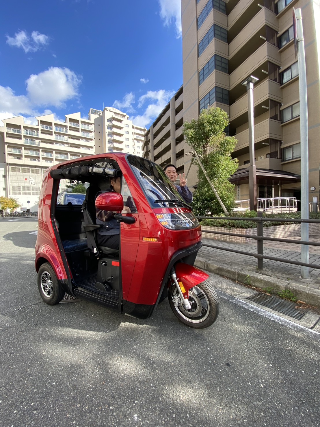 真っ赤な車体は尼崎の街並みでも存在感抜群!実際にハンドルを握られたマスターも、そのスムーズな動きに驚かれたご様子で、「小回りが利いて運転しやすく、日常の足として便利そう」という感触を持っていただけたようです。