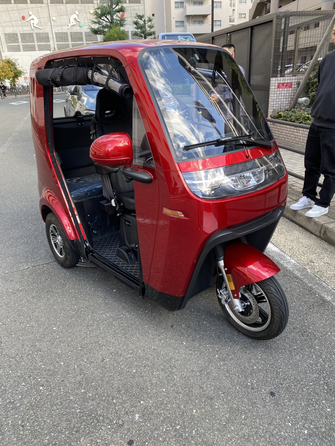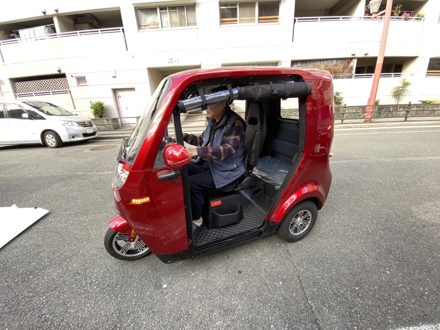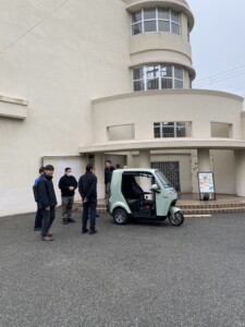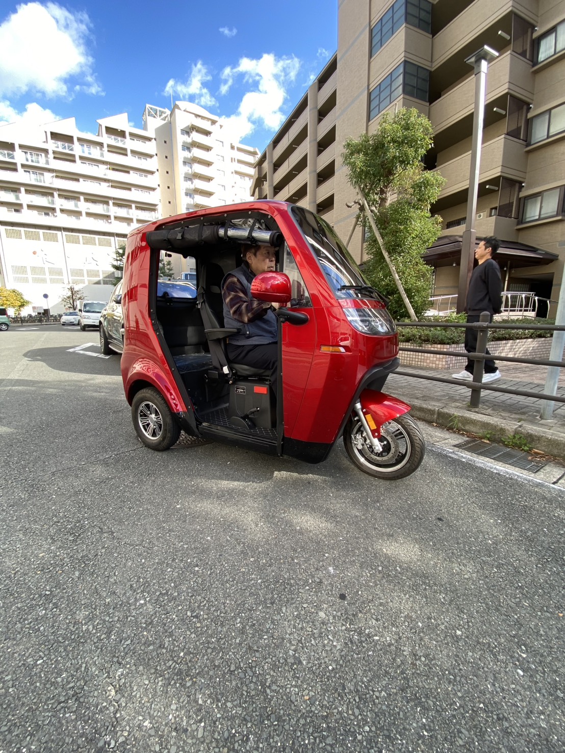 真っ赤な車体は尼崎の街並みでも存在感抜群!実際にハンドルを握られたマスターも、そのスムーズな動きに驚かれたご様子で、「小回りが利いて運転しやすく、日常の足として便利そう」という感触を持っていただけたようです。
